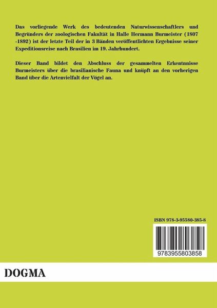 Dieser Band bildet den Abschluss der gesammelten Erkentnnisse Burmeisters über die brasilianische Fauna und knüpft an den vorherigen Band über die Artenvielfalt der Vögel an.