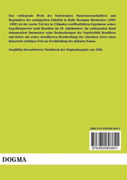 Das vorliegende Werk des bedeutenden Naturwissenschaftlers und Begründers der zoologischen Fakultät in Halle Hermann Burmeister (1807 -1892) ist der zweite Teil der in 3 Bänden veröffentlichten Ergebnisse seiner Expeditionsreise nach Brasilien im 19. Jahrhundert. Im vorliegenden Band dokumentiert Burmeister seine Beobachtungen der Vogelvielfalt Brasiliens und liefert mit seiner detaillierten Beschreibung der einzelnen Arten einen historisch wichtigen Teil zur Erschließung der globalen Fauna.