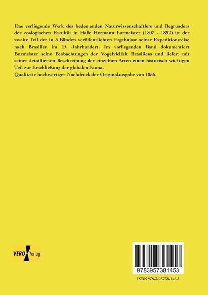 Das vorliegende Werk des bedeutenden Naturwissenschaftlers und Begründers der zoologischen Fakultät in Halle Hermann Burmeister (1807 - 1892) ist der zweite Teil der in 3 Bänden veröffentlichten Ergebnisse seiner Expeditionsreise nach Brasilien im 19. Jahrhundert. Im vorliegenden Band dokumentiert Burmeister seine Beobachtungen der Vogelvielfalt Brasiliens und liefert mit seiner detaillierten Beschreibung der einzelnen Arten einen historisch wichtigen Teil zur Erschließung der globalen Fauna.