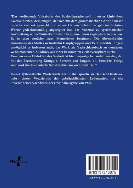 Dieses systematische Wörterbuch der Suahelisprache in Deutsch-Ostafrika, nebst einem Verzeichnis der gebräuchlichsten Redensarten, ist ein unveränderter Nachdruck der Originalausgabe von 1902.