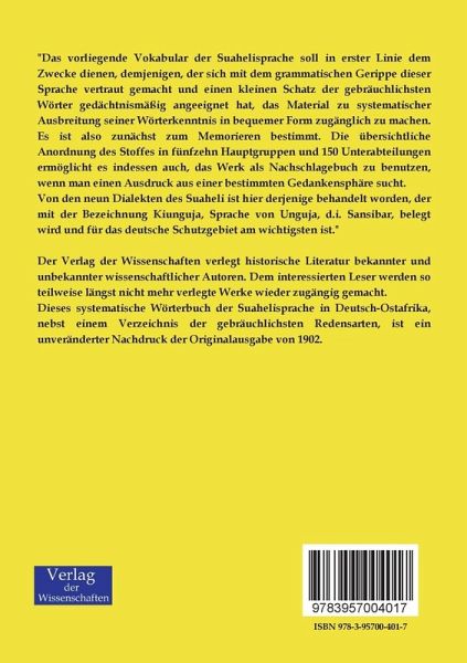 Dieses systematische Wörterbuch der Suahelisprache in Deutsch-Ostafrika, nebst einem Verzeichnis der gebräuchlichsten Redensarten, ist ein unveränderter Nachdruck der Originalausgabe von 1902.
