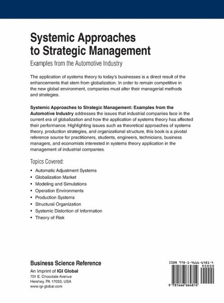 The application of systems theory to today's businesses is a direct result of the enhancements that stem from globalization. In order to remain competitive in the new global environment, companies must alter their managerial methods and strategies. Systemic Approaches to Strategic Management: Examples from the Automotive Industry addresses the issues that industrial companies face in the current era of globalization and how the application of systems theory has affected their performance. Highlighting issues such as theoretical approaches of systems theory, production strategies, and organizational structure, this book is a pivotal reference source for practitioners, students, engineers, technicians, business managers, and economists interested in systems theory application in the management of industrial companies.