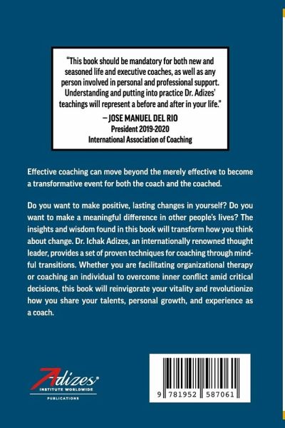 Discover a different world of coaching. A world where a holistic, integrative approach gives you the practical tools to not only differentiate your coaching from others who use conventional, one-size-fits-all canned methods, but also to grow yourself in the mastery of self-management and, ultimately, to become whole. The key that unlocks this shift to the next level of self-coaching and proactive guidance of others is the Adizes Methodology of systemic coaching. Do you want to make positive, lasting changes in yourself? Do you want to make a meaningful difference in other people's lives? The insights and wisdom found in this book will transform how you think about change. Dr. Ichak Adizes, an Internationally renowned thought leader, provides a set of proven techniques for coaching through mindful transitions. Whether you are facilitating organizational therapy or coaching an individual to overcome inner conflict amid critical decisions, this book will reinvigorate your vitality and revolutionize how you share your talents, personal growth, and experience in your sphere of influence.