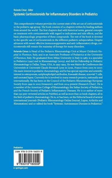 Introduction. - Disease background: juvenile inflammatory disorders. - Mode of action of corticosteroids, PK/PD. - Side effects and specific considerations for the use of corticosteroids in children. - Efficacy and place in therapy of systemic corticosteroids for juvenile inflammatory disorders. - Summary/conclusions: future prospects for reducing the burden of corticosteroid use in children. Systemic Corticosteroids for Autoimmune/Inflammatory Disorders in Children Introduction.- Corticosteroids in the Treatment of Childhood Rheumatic Diseases: An Historical Review.- Systemic Corticosteroids for Autoimmune/Inflammatory Disorders in Children.- The clinical pharmacology of past, present, and future glucocorticoids.- The molecular mechanisms responsible for the anti-inflammatory and immunosuppressive effects of glucocorticoids.- CORTICOSTEROIDS IN JUVENILE IDIOPATHIC ARTHRITIS.- Systemic Corticosteroids in Childhood Vasculitides.- Steroids in paediatric-onset SLE and other connective tissue diseases.- GLUCOCORTICOID IN PEDIATRIC GASTROINTESTINAL DISORDERS.- CORTICOSTEROIDS IN PEDIATRIC DERMATOLOGY.- Corticosteroids in pediatric endocrinology.- SYSTEMIC CORTICOSTEROIDS IN RESPIRATORY DISEASES IN CHILDREN.- Corticosteroids in Paediatric Nephrology.- Corticosteroids in neonatology: Postnatal corticosteroids in preterm infants with bronchopulmonary dysplasia (BPD).
