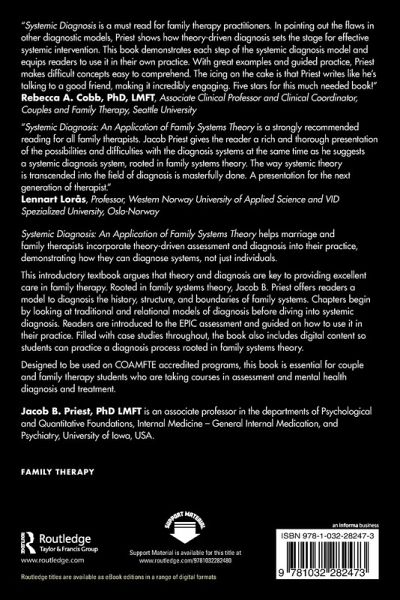 "Systemic Diagnosis is a must read for family therapy practitioners. In pointing out the flaws in other diagnostic models, Priest shows how theory-driven diagnosis sets the stage for effective systemic intervention. This book demonstrates each step of the systemic diagnosis model and equips readers to use it in their own practice. With great examples and guided practice, Priest makes difficult concepts easy to comprehend. The icing on the cake is that Priest writes like he's talking to a good friend, making it incredibly engaging. Five stars for this much needed book!"