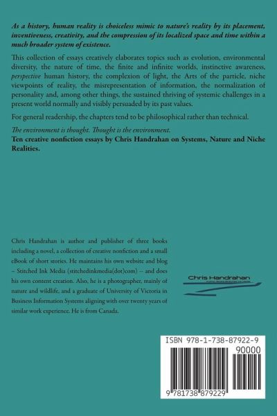 For evolution to properly function, the environment must transform to permit fresh, innovative possibilities to emerge.The first line of the initial essay begins the reconstruction of reality into niched, naturally evolved systems created as match for the universal forces permitting it to occur.The roots of beliefs and ideas are the same as all else pertinent to the survival of an evolved consciousness: its environment.The boundaries inhibiting former environments through experience of realities achieved pristine feats temporally sustained by adhering to coinciding limitations.Environments shape the intensity, abstraction, and suppression of awareness.As a history, human certainty is intended imitator to nature's reality by its placement, initiative, creativity, and the compression of its niched space and time within a much broader system of existence simultaneously encouraging and resisting its choices.This collection of essays creatively elaborates on the upheld, advanced challenges of a world normally and visibly persuaded by its evolutionary history.Book Tags: Nonfiction, Nature, Evolution, Science, Creativity, Individuality, Perspective, Philosophy, Essays Canadian author.