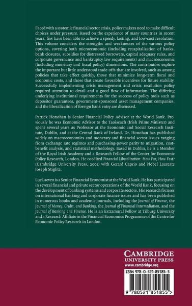 Faced with a systemic financial sector crisis, policymakers need to make difficult choices under pressure. Based on the experience of many countries in recent years, few have been able to achieve a speedy, lasting and low-cost resolution. This volume considers the strengths and weaknesses of the various policy options, covering both microeconomic (including recapitalization of banks, bank closures, subsidies for distressed borrowers, capital adequacy rules and corporate governance and bankruptcy law requirements) and macroeconomic (including monetary and fiscal policy) dimensions. The contributors explore the important but little understood trade-offs that are involved, such as between policies which take effect quickly, those which minimize long-term fiscal and economic costs, and those which create favorable incentives for future stability. Successfully implementing crisis management and crisis resolution policy required attention to detail and a good flow of information.