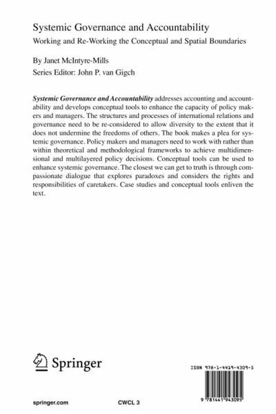 Systemic Governance addresses accounting and accountability and develops conceptual tools to enhance the capacity of policy makers and managers. The structures and processes of international relations and governance need to be re-considered to allow diversity to the extent that is does not undermine the freedoms of others. The book makes a plea for systemic governance. Policy makers and managers need to work with rather than within theoretical and methodological frameworks to achieve multidimensional and multilayered policy decisions. Conceptual tools can be used to enhance systemic governance. The closest we can get to truth is through compassionate dialogue that explores paradoxes and considers the rights and responsibilities of caretakers. Case studies and conceptual tools enliven the text.