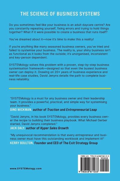Finally a step-by-step system that fixes owner dependent businesses. Do you sometimes feel like your business is an adult daycare centre? Are you constantly repeating yourself, fixing errors and trying to hold things together? What if it were possible to create a business that runs itself? You've dreamed about it - now it's time to make this a reality! If you're anything like many seasoned business owners, you've tried and failed to systemise your business. The reality is, your shiny business isn't as functional as it looks from the outside; it's unorganised, inconsistent and key-person dependent. SYSTEMology solves this problem with a proven, step-by-step business systemisation framework - designed so that even the busiest business owner can deploy it. Drawing on 20+ years of business experience and real-life case studies, David Jenyns details the path to complete business reliability. In this book you will discover:Why most business owners fail to systemise their business Where to get started and what systems must create first Why business owners are typically the worst people to document systems Why modelling your best team members is the best-kept secret to rapid systems Why you don't need (and shouldn't try) to systemise like McDonald's The best way to unlock innovation and strategies to skyrocket your creativity Simple strategies to get your team to follow your systems - even the stubborn ones How to make improving systems a regular part of your team's routine ¿Why systems-centred businesses always get higher multiples and sell for top dollar The fact is, systemising your business doesn't have to be time-consuming or overwhelming. You're just a few clicks away from having everything you need. SYSTEMology has worked for countless business owners worldwide, and it can work for you too. Just click that buy now button at the top of this page to get started.