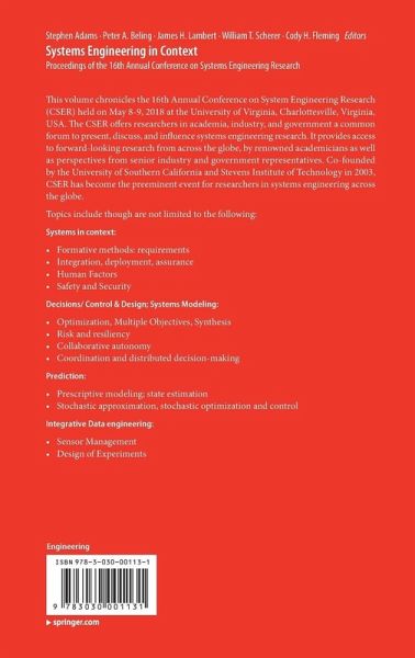 This volume chronicles the 16th Annual Conference on System Engineering Research (CSER) held on May 8-9, 2018 at the University of Virginia, Charlottesville, Virginia, USA. The CSER offers researchers in academia, industry, and government a common forum to present, discuss, and influence systems engineering research. It provides access to forward-looking research from across the globe, by renowned academicians as well as perspectives from senior industry and government representatives. Co-founded by the University of Southern California and Stevens Institute of Technology in 2003, CSER has…mehr