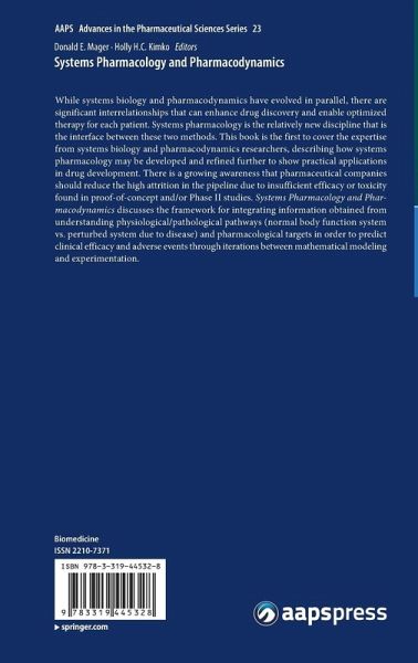 Role of Systems Modeling in Regulatory Drug Approval.- Quantitative Systems Pharmacology: Applications and Adoption in Drug Development.- Systems Pharmacology: An Overview.- Discrete dynamic modeling: a network approach for systems pharmacology.- Kinetic Models of Biochemical Signaling Networks.- Mechanistic Models of Physiological Control Systems.- Foundations of Pharmacodynamic Systems Analysis.- Direct, Indirect, and Signal Transduction Response Modeling.- Irreversible Pharmacodynamics.- Feedback Control Indirect Response Models.- Nonlinear Mixed Effects Modeling in Systems Pharmacology.- Detecting Pharmacokinetic and Pharmacodynamic Covariates From High-Dimensional Data.- Multi-Scale Modeling of Drug Action in the Nervous System.- Mechanistic Modeling of Inflammation.- Systems Pharmacology of Tyrosine Kinase Inhibitor-Associated Toxicities.- Translational Modeling of Antibacterial Agents.- Viral DynamicModeling of Hepatitis C Virus Infection: Past Successes and Future Challenges.- Using Systems Pharmacology to Advance Oncology Drug Development.- Systems Pharmacology Modeling in Type 2 Diabetes Mellitus.