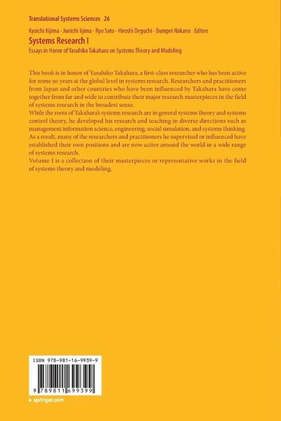This book is in honor of Yasuhiko Takahara, a first-class researcher who has been active for some 50 years at the global level in systems research. Researchers and practitioners from Japan and other countries who have been influenced by Takahara have come together from far and wide to contribute their major research masterpieces in the field of systems research in the broadest sense. While the roots of Takahara's systems research are in general systems theory and systems control theory, he developed his research and teaching in diverse directions such as management information science, engineering, social simulation, and systems thinking. As a result, many of the researchers and practitioners he supervised or influenced have established their own positions and are now active around the world in a wide range of systems research. Volume I is a collection of their masterpieces or representative works in the field of systems theory andmodeling.