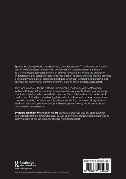 This book presents, for the first time, a practical guide to applying contemporary systems thinking methods in sport as well as case study applications demonstrating how their outputs can be translated in practice. The methods described in this book can be used for better understanding the systemic influences in a broad range of sport contexts, including performance, injury, team functioning, decision making, adverse incidents, sports organisation design and redesign, technology implementation, and proactive risk assessments.