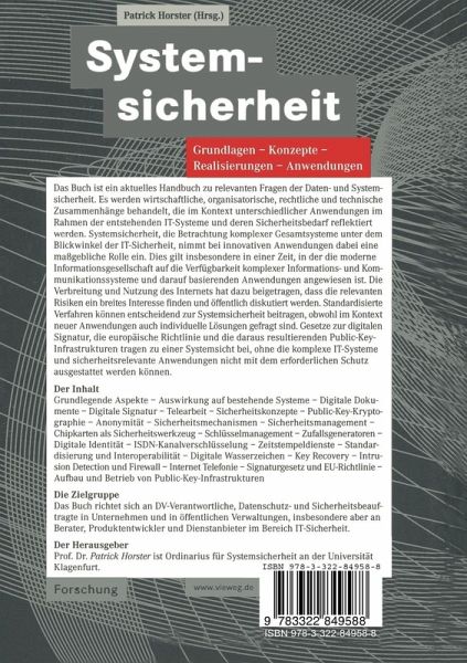 Das Buch ist das massgebliche aktuelle Handbuch zu allen Fragen der Daten- bzw. Systemsicherheit. Es richtet sich an DV-Verantwortliche, Datenschutz- und Sicherheitsbeauftragte in Unternehmen und in öffentlichen Verwaltungen, insbesondere zudem an Berater, Produktentwickler und Dienstanbieter im Bereich IT-Sicherheit. Die moderne Informationsgesellschaft ist auf die Verfügbarkeit komplexer Informations- und Kommunikationssysteme angewiesen. Bei innovativen Anwendungen treten zunehmend Aspekte der Systemsicherheit in den Vordergrund. Die Verbreitung und Nutzung des Internets hat dazu beigetragen, dass die relevanten Risiken ein breites Interesse finden und öffentlich diskutiert werden. Standardisierte Verfahren können entscheidend zur Systemsicherheit beitragen, obwohl im Kontext neuer Anwendungen auch individuelle Lösungen gefragt sind. Gesetze zur digitalen Signatur, die europäische Richtlinie und die daraus resultierenden Public-Key-Infrastrukturen tragen zu einer Systemsicht bei, ohne die komplexe IT-Systeme und sicherheitsrelevante Anwendungen nicht mit dem erforderlichen Schutz ausgestattet werden können. Wirtschaftliche, organisatorische, rechtliche und technische Zusammenhänge werfen dabei Fragen auf, die im Kontext unterschiedlicher Anwendungen aus Sicht der Systemsicherheit reflektiert werden.
