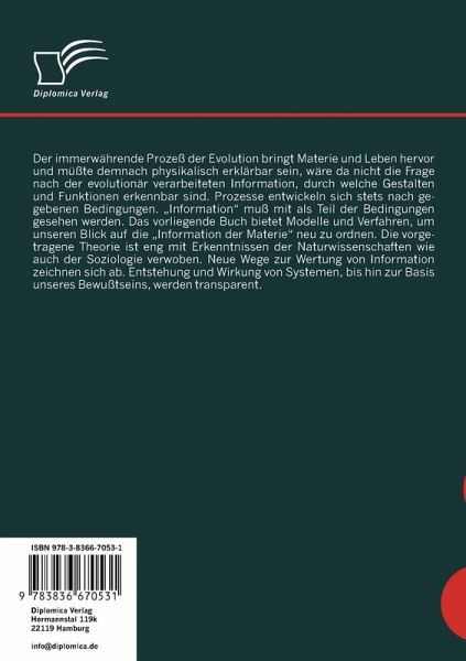 Die Evolution ist ein immerwährender universaler Prozeß. Aus ihm gehen Materie und Leben hervor und er ist auch mit Änderungen an all seinen Kreationen befaßt. So nahe es nun liegt, solche Prozesse physikalisch und biologisch zu erklären, wir sehen uns in den Themenkreis "Information" versetzt, wo wir Selbstorganisation und Komplexität der evolutiven Ergebnisse zu verstehen suchen. "Information" ist unmittelbar mit jenem immerwährenden Prozeß der Evolution verknüpft. Erst die evolutionär verarbeitete Information ist es, die uns Gestalten und Funktionen erkennbar macht. Prozesse entwickeln sich stets nach Bedingungen, welche direkt oder indirekt aus individuellen Situationen und Ereignissen der Umwelt resultieren. "Information" muß mit als Teil der Bedingungen gesehen werden. Jedoch über die Evolution zurück geschaut, ist schwer vorstellbar, daß "Information" nach linearen Maßstäben wirksam wurde. Deshalb rückt die aus der Physik bekannte "Harmonische Reihe" als das Ur-Maß für Information ins Blickfeld. Das vorliegende Buch zeigt Modelle und Verfahren, um unseren Blick auf die "Information der Materie" unter dieser Vorgabe neu zu ordnen. Die vorgetragene Theorie baut auf Erkenntnissen der Naturwissenschaften auf. Neue Wege zur Wertung von "Information" wie auch zur Überprüfung menschlicher Sinn- und Wertvorstellungen bieten sich an, materiell bis ethisch orientiert. Entstehung und Wirkung von Systemen, bis hin zur Basis unseres Bewußtseins, sollen sich mit diesem Buch als transparent erweisen.
