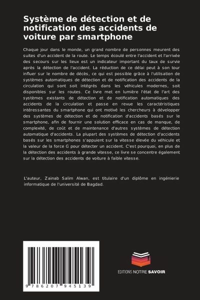 Chaque jour dans le monde, un grand nombre de personnes meurent des suites d'un accident de la route. Le temps écoulé entre l'accident et l'arrivée des secours sur les lieux est un indicateur important du taux de survie après la détection de l'accident. La réduction de ce délai peut à son tour influer sur le nombre de décès, ce qui est possible grâce à l'utilisation de systèmes automatiques de détection et de notification des accidents de la circulation qui sont soit intégrés dans les véhicules modernes, soit disponibles sur les routes. Ce livre met en lumière l'état de l'art des systèmes existants de détection et de notification automatiques des accidents de la circulation et passe en revue les caractéristiques intéressantes du smartphone qui ont motivé les chercheurs à développer des systèmes de détection et de notification d'accidents basés sur le smartphone, afin de fournir une solution efficace en cas de manque, de complexité, de coût et de maintenance d'autres systèmes de détection automatique d'accidents. La plupart des systèmes de détection d'accidents basés sur les smartphones s'appuient sur la vitesse élevée du véhicule et la valeur de la force G pour détecter un accident. C'est pourquoi, en plus de la détection des accidents à grande vitesse, ce livre se concentre également sur la détection des accidents de voiture à faible vitesse.
