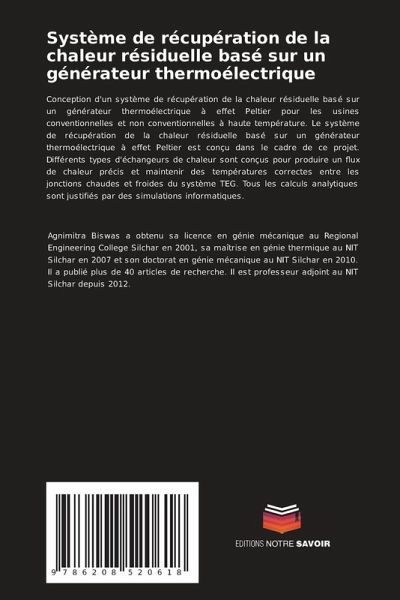 Conception d'un système de récupération de la chaleur résiduelle basé sur un générateur thermoélectrique à effet Peltier pour les usines conventionnelles et non conventionnelles à haute température. Le système de récupération de la chaleur résiduelle basé sur un générateur thermoélectrique à effet Peltier est conçu dans le cadre de ce projet. Différents types d'échangeurs de chaleur sont conçus pour produire un flux de chaleur précis et maintenir des températures correctes entre les jonctions chaudes et froides du système TEG. Tous les calculs analytiques sont justifiés par des simulations informatiques.