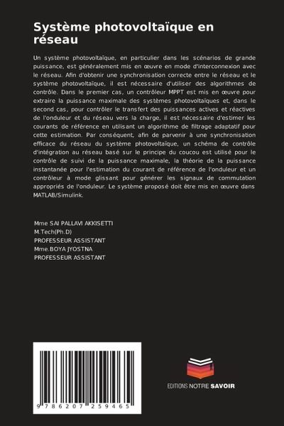 Un système photovoltaïque, en particulier dans les scénarios de grande puissance, est généralement mis en oeuvre en mode d'interconnexion avec le réseau. Afin d'obtenir une synchronisation correcte entre le réseau et le système photovoltaïque, il est nécessaire d'utiliser des algorithmes de contrôle. Dans le premier cas, un contrôleur MPPT est mis en oeuvre pour extraire la puissance maximale des systèmes photovoltaïques et, dans le second cas, pour contrôler le transfert des puissances actives et réactives de l'onduleur et du réseau vers la charge, il est nécessaire d'estimer les courants de référence en utilisant un algorithme de filtrage adaptatif pour cette estimation. Par conséquent, afin de parvenir à une synchronisation efficace du réseau du système photovoltaïque, un schéma de contrôle d'intégration au réseau basé sur le principe du coucou est utilisé pour le contrôle de suivi de la puissance maximale, la théorie de la puissance instantanée pour l'estimation du courant de référence de l'onduleur et un contrôleur à mode glissant pour générer les signaux de commutation appropriés de l'onduleur. Le système proposé doit être mis en oeuvre dans MATLAB/Simulink.