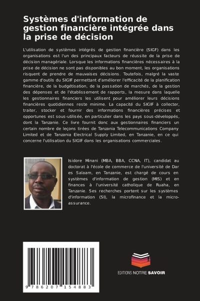 L'utilisation de systèmes intégrés de gestion financière (SIGF) dans les organisations est l'un des principaux facteurs de réussite de la prise de décision managériale. Lorsque les informations financières nécessaires à la prise de décision ne sont pas disponibles au bon moment, les organisations risquent de prendre de mauvaises décisions. Toutefois, malgré la vaste gamme d'outils du SIGIF permettant d'améliorer l'efficacité de la planification financière, de la budgétisation, de la passation de marchés, de la gestion des dépenses et de l'établissement de rapports, la mesure dans laquelle les gestionnaires financiers les utilisent pour améliorer leurs décisions financières quotidiennes reste minime. La capacité du SIGIF à collecter, traiter, stocker et fournir des informations financières précises et opportunes est sous-utilisée, en particulier dans les pays sous-développés, dont la Tanzanie. Ce livre fournit donc aux gestionnaires financiers un certain nombre de leçons tirées de Tanzania Telecommunications Company Limited et de Tanzania Electrical Supply Limited, en Tanzanie, en ce qui concerne l'utilisation du SIGIF dans les organisations commerciales.