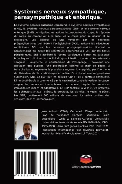 Le système nerveux autonome comprend le système nerveux sympathique (SNS), le système nerveux parasympathique (SNP) et le système nerveux entérique (SNE) qui régulent les actions inconscientes du corps, la réponse du corps au combat ou à la fuite, et le corps pour se nourrir et se reproduire. Les signaux du SNS voyagent par les neurones préganglionnaires qui libèrent l'acétylcholine (ACh), activant les récepteurs nicotiniques ACh sur les neurones post-ganglionnaires, libérant la noradrénaline qui active les récepteurs adrénergiques (AR) sur les tissus périphériques. SNS : accélère le rythme cardiaque ; élargit les passages bronchiques ; diminue la motilité du gros intestin ; resserre les vaisseaux sanguins ; augmente le péristaltisme de l'oesophage ; provoque une dilatation des pupilles, une piloérection comme la chair de poule, la transpiration et augmente la pression sanguine. L'amygdale, par l'hormone de libération de la corticotrophine, active l'axe hypothalamo-hypophyso-surrénalien. SNS beta2 L'AR sur les cellules CD4+T et B contrôle l'immunité. L'immunothérapie a commencé par la vaccination contre la variole, le cancer stoppe les réponses immunitaires. Le cerveau régule les réponses immunitaires innées et adaptatives. Le SNP contrôle la vessie, les uretères, les sphincters anaux, l'utérus, la prostate, les glandes, le vagin, le pénis. Les SNP, contiennent 600 millions de neurones. La rétine contient des vésicules denses adrénergiques.