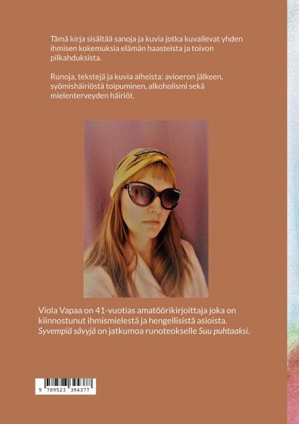 Kirja sisältää sanoja ja kuvia jotka kuvailevat yhden ihmisen kokemuksia elämän haasteista ja toivon pilkahduksista. Runoja, tekstejä ja kuvia aiheista: avioeron jälkeen, syömishäiriöstä toipuminen, alkoholismi sekä mielenterveyden häiriöt.