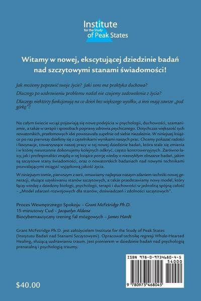 Witamy w nowej, ekscytującej dziedzinie badań nad szczytowymi stanami świadomości! Jak możemy poprawic swoje życie? Jaki sens ma praktyka duchowa? Dlaczego po uzdrowieniu problemu nadal nie czujemy zadowolenia z życia? Dlaczego niektórzy funkcjonują na co dzień bez większego wysilku, a inni mają zawsze "pod górkę"? Na calym świecie wciąż pojawiają się nowe podejścia w psychologii, duchowości, szamanizmie, a także w terapii i sposobach poprawy zdrowia psychicznego. Dotychczas większośc tych nowatorskich, przelomowych idei powstawala zupelnie od siebie niezależnie. W niniejszej książce po raz pierwszy wspólpracujemy ze sobą dzieląc się wynikami naszej pracy. Chcemy dac czytelnikowi posmak naszej fascynującej wspólnej pracy w dziedzinie, która nieustannie się zmienia, a także przedstawic nowe odkrycia, syntezy i kontrowersje. Zarówno laicy, jak i profesjonaliści znajdą w tej książce porcję wiedzy o niezwyklym obszarze badań, jakim są szczytowe stany świadomości, oraz o nowatorskich badaniach nad nowymi technikami pozwalającymi osiągac wyjątkową jakośc życia. W niniejszym tomie, pierwszym z serii, omawiamy najlepsze naszym zdaniem techniki nowej generacji, slużące uzyskiwaniu stanów szczytowych, a także przedstawiamy nowy model, który lączy wiedzę z dziedziny biologii, psychologii, terapii i duchowości w jednolitą spójną calośc - "Model zdarzeń rozwojowych dla stanów, doświadczeń i zdolności szczytowych".