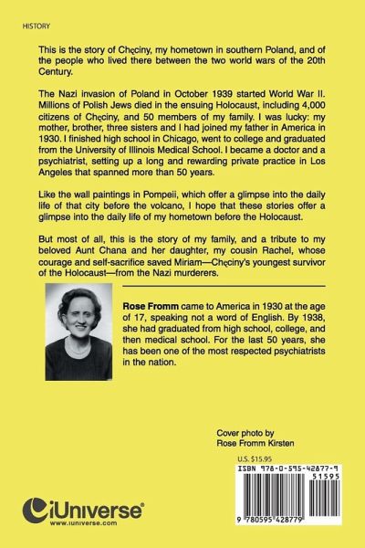 This is the story of Chciny, my hometown in southern Poland, and of the people who lived there between the two world wars of the 20th Century. The Nazi invasion of Poland in October 1939 started World War II. Millions of Polish Jews died in the ensuing Holocaust, including 4,000 citizens of Chciny, and 50 members of my family. I was lucky: my mother, brother, three sisters and I had joined my father in America in 1930. I finished high school in Chicago, went to college and graduated from the University of Illinois Medical School. I became a doctor and a psychiatrist, setting up a long and rewarding private practice in Los Angeles that spanned more than 50 years. Like the wall paintings in Pompeii, which offer a glimpse into the daily life of that city before the volcano, I hope that these stories offer a glimpse into the daily life of my hometown before the Holocaust. But most of all, this is the story of my family, and a tribute to my beloved Aunt Chana and her daughter, my cousin Rachel, whose courage and self-sacrifice saved Miriam-Chciny's youngest survivor of the Holocaust-from the Nazi murderers.