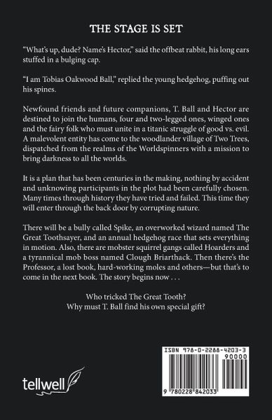 The Stage Is Set "What's up, dude? Name's Hector," said the offbeat rabbit, his long ears stuffed in a bulging cap. "I am Tobias Oakwood Ball," replied the young hedgehog, puffing out his spines. Newfound friends and future companions, T. Ball and Hector are destined to join the humans, four and two-legged ones, winged ones and the fairy folk who must unite in a titanic struggle of good vs. evil. A malevolent entity has come to the woodlander village of Two Trees, dispatched from the realms of the Worldspinners with a mission to bring darkness to all the worlds. It is a plan that has been centuries in the making, nothing by accident and unknowing participants in the plot had been carefully chosen. Many times through history they have tried and failed. This time they will enter through the back door by corrupting nature. There will be a bully called Spike, an overworked wizard named The Great Toothsayer, and an annual hedgehog race that sets everything in motion. Also, there are mobster squirrel gangs called Hoarders and a tyrannical mob boss named Clough Briarthack. Then there's the Professor, a lost book, hard-working moles and others-but that's to come in the next book. The story begins now . . . Who tricked The Great Tooth? Why must T. Ball find his own special gift?
