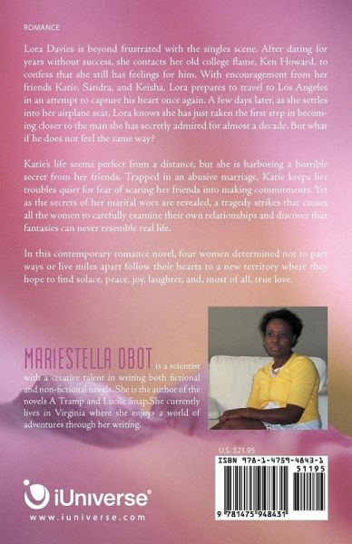 Lora Davies is beyond frustrated with the singles scene. After dating for years without success, she contacts her old college flame, Ken Howard, to confess that she still has feelings for him. With encouragement from her friends Katie, Sandra, and Keisha, Lora prepares to travel to Los Angeles in an attempt to capture his heart once again. A few days later, as she settles into her airplane seat, Lora knows she has just taken the first step in becoming closer to the man she has secretly admired for almost a decade. But what if he does not feel the same way? Katie's life seems perfect from a distance, but she is harboring a horrible secret from her friends. Trapped in an abusive marriage, Katie keeps her troubles quiet for fear of scaring her friends into making commitments. Yet as the secrets of her marital woes are revealed, a tragedy strikes that causes all the women to carefully examine their own relationships and discover that fantasies can never resemble real life. In this contemporary romance novel, four women determined not to part ways or live miles apart follow their hearts to a new territory where they hope to find solace, peace, joy, laughter, and, most of all, true love.