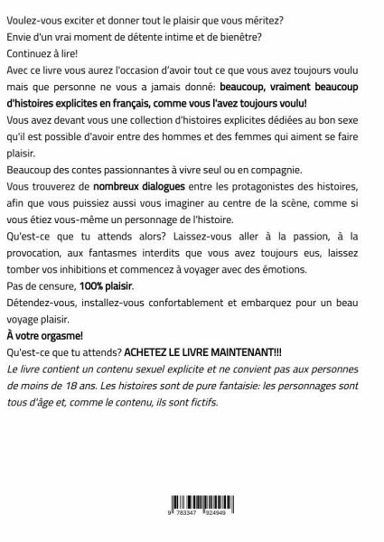 Voulez-vous exciter et donner tout le plaisir que vous méritez?Envie d'un vrai moment de détente intime et de bienêtre?Continuez à lire!Avec ce livre vous aurez l'occasion d'avoir tout ce que vous avez toujours voulu mais que personne ne vous a jamais donné: beaucoup, vraiment beaucoup d'histoires explicites en français, comme vous l'avez toujours voulu!Vous avez devant vous une collection d'histoires explicites dédiées au bon sexe qu'il est possible d'avoir entre des hommes et des femmes qui aiment se faire plaisir. Beaucoup des contes passionnantes à vivre seul ou en compagnie.Vous trouverez de nombreux dialogues entre les protagonistes des histoires, afin que vous puissiez aussi vous imaginer au centre de la scène, comme si vous étiez vous-même un personnage de l'histoire.Qu'est-ce que tu attends alors? Laissez-vous aller à la passion, à la provocation, aux fantasmes interdits que vous avez toujours eus, laissez tomber vos inhibitions et commencez à voyager avec des émotions.Pas de censure, 100 pour 100 de plaisir.Détendez-vous, installez-vous confortablement et embarquez pour un beau voyage plaisir.À votre orgasme!