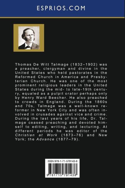 Thomas De Witt Talmage (1832-1902) was a preacher, clergyman and divine in the United States who held pastorates in the Reformed Church in America and Presbyterian Church. He was one of the most prominent religious leaders in the United States during the mid- to late-19th century, equaled as a pulpit orator perhaps only by Henry Ward Beecher. He also preached to crowds in England. During the 1860s and 70s, Talmage was a well-known reformer in New York City and was often involved in crusades against vice and crime. During the last years of his life, Dr. Talmage ceased preaching and devoted himself to editing, writing, and lecturing. At different periods he was editor of the Christian at Work (1873-76) and New York; the Advance (1877-79).