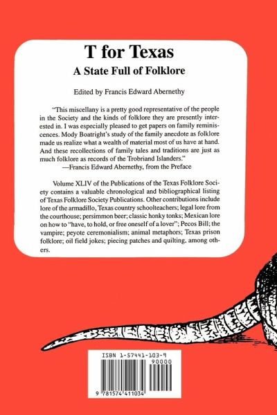 This Publication of the Texas Folklore Society contains a valuable chronological and bibliographical listing of Texas Folklore Society publications. It also includes twenty-five folk tales, including the lore of the armadillo, Texas country schoolteachers; legal lore from the courthouse; persimmon beer; classic honky tonks; Mexican lore on how to "have, hold, or free oneself of a lover"; Pecos Bill; the vampire; peyote ceremonialism; animal metaphors; Texas prison folklore; oil field jokes; and quilting, among others.