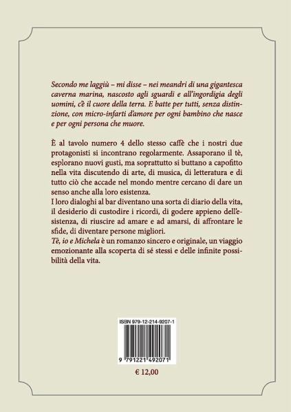 Secondo me laggiù - mi disse - nei meandri di una gigantesca caverna marina, nascosto agli sguardi e all'ingordigia degli uomini, c'è il cuore della terra. E batte per tutti, senza distinzione, con micro-infarti d'amore per ogni bambino che nasce e per ogni persona che muore. È al tavolo numero 4 dello stesso caffè che i nostri due protagonisti si incontrano regolarmente. Assaporano il tè, esplorano nuovi gusti, ma soprattutto si buttano a capofitto nella vita discutendo di arte, di musica, di letteratura e di tutto ciò che accade nel mondo mentre cercano di dare un senso anche alla loro esistenza. I loro dialoghi al bar diventano una sorta di diario della vita, il desiderio di custodire i ricordi, di godere appieno dell'esistenza, di riuscire ad amare e ad amarsi, di affrontare le sfide, di diventare persone migliori. Tè, io e Michela è un romanzo sincero e originale, un viaggio emozionante alla scoperta di sé stessi e delle infinite possibilità della vita.