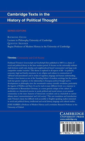 Ferdinand Tönnies' Gemeinschaft und Gesellschaft (first published in 1887) is a classic of social and political theory, which explores the clash between small-scale neighbourhood-based 'communities' and large-scale competitive market 'societies'. Tönnies considers all aspects of life - political, economic, legal and family; art, religion and culture; the construction of 'selfhood' and 'personhood'; and modes of cognition, language and understanding. Often recognised as one of the founding texts of sociology, Gemeinschaft und Gesellschaft is also a highly significant contribution to European political thought and philosophy, with particular relevance to the legacies of Hobbes and Kant. It is at once a response to modernity, a theoretical exercise in social, political and moral science, and an unusual commentary on the inner character of 'democratic socialism'. This new English rendition will introduce Tönnies' work to a fresh generation of English-speaking readers with interests in social and political theory and the history of European ideas.