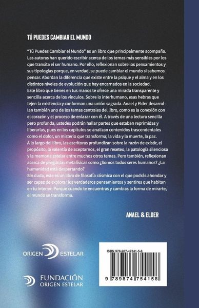 "Tú Puedes Cambiar el Mundo" es un libro que principalmente acompaña. Las autoras han querido escribir acerca de los temas más sensibles por los que transita el ser humano. Por ello, reflexionan sobre los pensamientos y sus tipologías porque, en verdad, se puede cambiar el mundo si sabemos pensar. Abordan la diferencia que existe entre la psique y el alma y en los distintos niveles de evolución que hay encarnados en la sociedad. Este libro que tienes en tus manos te ofrece una mirada transparente y sencilla acerca de los vínculos. Sobre lo interhumano, esas hebras que tejen la existencia y conforman una unión sagrada. Anael y Elder desarrollan también uno de los temas centrales del libro, como es la conexión con el corazón y el proceso de enlazar con él. A través de una lectura sencilla pero profunda, ustedes podrán hallar partes que estaban reprimidas y liberarlas, pues en los capítulos se analizan contenidos trascendentales como el dolor, un misterio que transforma; la vida y la muerte, la paz. A lo largo del libro, las escritoras profundizan sobre la razón de existir, el propósito, la valentía de aceptarnos, el gran reseteo, la patología silenciosa y la memoria estelar entre muchos otros temas. Pero también, reflexionan acerca de preguntas metafísicas como ¿Somos todos seres humanos? ¿La humanidad está despertando? Sin duda, este es un libro de filosofía cósmica con el que podrás ahondar y ser capaz de explorar los verdaderos pensamientos y sentires que habitan en tu interior. Porque cuando te encuentras y cambias la forma de mirarte, el mundo se transforma.