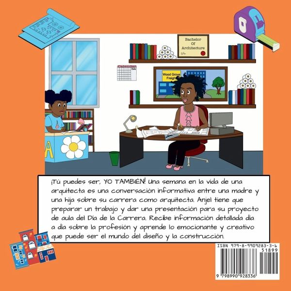 ¡Tú puedes ser, YO TAMBIÉN! Una semana en la vida de una arquitecta es una conversación informativa entre una madre y una hija sobre su carrera como arquitecta. Anjel tiene que preparar un trabajo y dar una presentación para su proyecto de aula del Día de la Carrera. Recibe información detallada día a día sobre la profesión y aprende lo emocionante y creativo que puede ser el mundo del diseño y la construcción. Este libro de cuentos y para colorear para niños es lo que desearía haber tenido cuando era niña. Me encantaba jugar con bloques de construcción, colorear y simplemente ser creativa. Descubrí mi amor por la arquitectura en la escuela secundaria. Recibí mi licencia de arquitectura en 2009, en ese momento, era una de las primeras 500 arquitectas afroamericanas con licencia en los Estados Unidos de América de una profesión de poco más de 219 000 arquitectos registrados (0,002 %). Este número es demasiado bajo. Mi libro de cuentos y mi libro para colorear son un testimonio de mi trayectoria en esta profesión. Tengo la esperanza de que generen conciencia e inspiración para la próxima generación de futuros arquitectos.