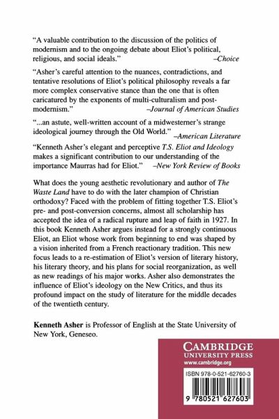 Author Kenneth Asher argues that politics provided the intellectual framework Eliot employed throughout his career. The focus of this political dimension separates this book from previous studies of Eliot. The result is a reestimation of Eliot's view of literary history and theory and new appraisals of several major poems and plays.