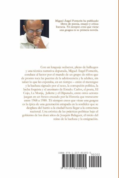 Con un lenguaje seductor, pleno de hallazgos y una técnica narrativa depurada, Miguel Ángel Fornerín, conduce al lector por el mundo de un grupo de niños que de pronto toca las puertas de la adolescencia y la adultez, sin saber lo que les esperaba, en un tiempo - entre el merengue y la bachatä signado por el sexo, la corrupción política, la luch...a foquista y el asesinato de Estado. Carlos, el poeta, El Cojo, La Monja, Juliette y el Diputado, entre otros actores juegan en un fresco cruzado por la Historia que transcurre entre 1968 a 1980. Tú siempre crees que viene una guagua es la épica de una generación atrapada en la sordidez que se desplaza del barrio a la ciudad hasta llegar a la estructura nacional. Una crónica de las prácticas políticas bajo el gobierno de los doce años de Joaquín Balaguer, el inicio del reino de la bachata y la emigración.