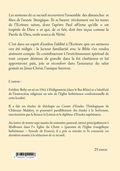 Les sermons de ce recueil recouvrent l'ensemble des dimanches et fêtes de l'année liturgique. Ils se basent résolument sur les textes de l'Ecriture sainte, dont l'apôtre Paul affirme qu'elle « est inspirée de Dieu » et qui, de ce fait, doit être reçue comme la Parole de Dieu, seule source de Vérité. C'est dans un esprit d'entière fidélité à l'Ecriture que ces sermons ont été rédigés : le lecteur familiarisé avec la Bible s'en rendra aisément compte. Ils contribueront à l'enrichissement spirituel de tout croyant désireux de grandir dans la foi chrétienne et lui apporteront paix, joie et réconfort dans l'assurance du salut gratuit en Jésus-Christ, l'unique Sauveur.