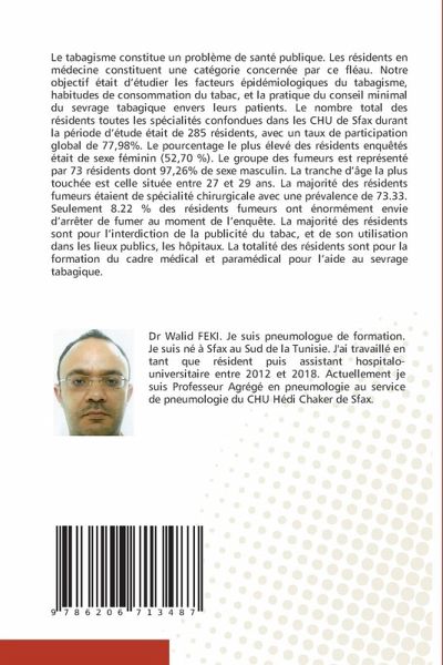 Le tabagisme constitue un problème de santé publique. Les résidents en médecine constituent une catégorie concernée par ce fléau. Notre objectif était d'étudier les facteurs épidémiologiques du tabagisme, habitudes de consommation du tabac, et la pratique du conseil minimal du sevrage tabagique envers leurs patients. Le nombre total des résidents toutes les spécialités confondues dans les CHU de Sfax durant la période d'étude était de 285 résidents, avec un taux de participation global de 77,98%. Le pourcentage le plus élevé des résidents enquêtés était de sexe féminin (52,70 %). Le groupe des fumeurs est représenté par 73 résidents dont 97,26% de sexe masculin. La tranche d'âge la plus touchée est celle située entre 27 et 29 ans. La majorité des résidents fumeurs étaient de spécialité chirurgicale avec une prévalence de 73.33. Seulement 8.22 % des résidents fumeurs ont énormément envie d'arrêter de fumer au moment de l'enquête. La majorité des résidents sont pour l'interdiction de la publicité du tabac, et de son utilisation dans les lieux publics, les hôpitaux. La totalité des résidents sont pour la formation du cadre médical et paramédical pour l'aide au sevrage tabagique.