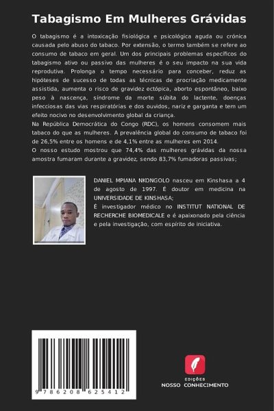 O tabagismo é a intoxicação fisiológica e psicológica aguda ou crónica causada pelo abuso do tabaco. Por extensão, o termo também se refere ao consumo de tabaco em geral. Um dos principais problemas específicos do tabagismo ativo ou passivo das mulheres é o seu impacto na sua vida reprodutiva. Prolonga o tempo necessário para conceber, reduz as hipóteses de sucesso de todas as técnicas de procriação medicamente assistida, aumenta o risco de gravidez ectópica, aborto espontâneo, baixo peso à nascença, síndrome da morte súbita do lactente, doenças infecciosas das vias respiratórias e dos ouvidos, nariz e garganta e tem um efeito nocivo no desenvolvimento global da criança.Na República Democrática do Congo (RDC), os homens consomem mais tabaco do que as mulheres. A prevalência global do consumo de tabaco foi de 26,5% entre os homens e de 4,1% entre as mulheres em 2014.O nosso estudo mostrou que 74,4% das mulheres grávidas da nossa amostra fumaram durante a gravidez, sendo 83,7% fumadoras passivas;