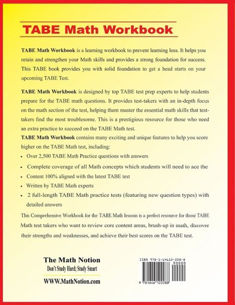 Prepare for The TABE Math Test with a Perfect Workbook! TABE Math Workbook is a learning workbook to prevent learning loss. It helps you retain and strengthen your Math skills and provides a strong foundation for success. This TABE book provides you with solid foundation to get a head starts on your upcoming TABE Test. TABE Math Workbook is designed by top TABE test prep experts to help students prepare for the TABE math questions. It provides test-takers with an in-depth focus on the math section of the test, helping them master the essential math skills that test-takers find the most troublesome. This is a prestigious resource for those who need an extra practice to succeed on the TABE Math test. TABE Math Workbook contains many exciting and unique features to help you score higher on the TABE Math test, including: * Over 2,500 TABE Math Practice questions with answers * Complete coverage of all Math concepts which students will need to ace the TABE test * Content 100% aligned with the latest TABE test * Written by TABE Math experts * 2 full-length TABE Math practice tests (featuring new question types) with detailed answers This Comprehensive Workbook for the TABE Math lessons is a perfect resource for those TABE Math test takers who want to review core content areas, brush-up in math, discover their strengths and weaknesses, and achieve their best scores on the TABE test. Published By: The Math Notion www.mathnotion.com