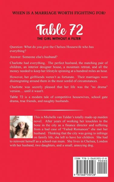 Question: What do you give the Chelsea Housewife who has everything? Answer: Someone else's husband? Charlotte had everything. The perfect husband, the matching pair of children, an interior designer house, a mountain retreat, and all the money needed to keep her lifestyle spinning at a hundred miles an hour. However, her girlfriends weren't as fortunate. Their marriages were disintegrating around them in the most sordid of circumstances. Charlotte was secretly pleased that her life was the "no drama" version... until it wasn't. Table 72 is a modern tale of competitive housewives, school gate drama, true friends, and naughty husbands. --- PROLOGUEAlison Moyet crooned softly in the background. "I'm all cried out You took a whole lot of loving for A handful of nothing All cried out It's hard to give you something when You're pushing and shoving me around"She peaked through the keyhole and took a sharp intake of breath. It was him. She hadn't stopped thinking about him, and in a moment of clarity, her heart stopped as she opened the front door with tears running down her red, freshly lasered cheeks.He stepped over the threshold, put his hand on the small of her back, pulled her suddenly toward his toned torso, and slammed the front door behind him. She accepted her fate without question, the inevitable pull of lust or love playing out in time to the pulsing music. Mid-morning light filtered through the back of the house, leaving no shadows, hiding nothing, illuminating her future. As much as she had tried to push him out, punish him for his wrongs. Charlotte closed her eyes, stood on her tiptoes, and turned her face up to meet him. The future was irrelevant. The past forgotten. The present was the only concern. Charlotte buried her face in his neck and breathed in deeply. Here he was at last. The only man she ever really loved. **Contains sexual content and adult humor.**