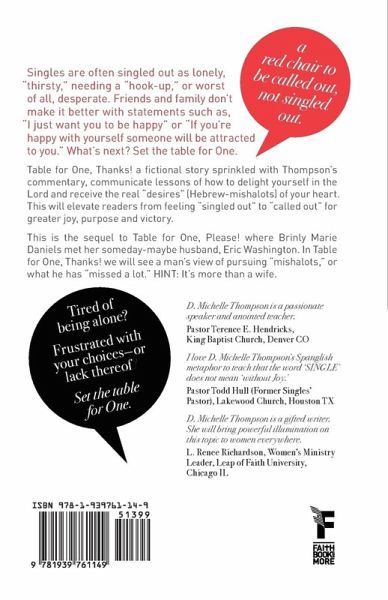 Singles are often singled out as lonely, "thirsty," needing a "hook-up," or worst of all, desperate. Friends and family don't make it better with statements such as, "I just want you to be happy" or "If you're happy with yourself someone will be attracted to you." What's next? Set the table for One. Table for One, Thanks! a fictional story sprinkled with Thompson's commentary, communicate lessons of how to delight yourself in the Lord and receive the real "desires" (Hebrew-mishalots) of your heart. This elevate readers from feeling "singled out" to "called out" for greater joy, purpose and victory. This is the sequel to Table for One, Please! where Brinly Marie Daniels met her someday-maybe husband, Eric Washington. In Table for One, Thanks! we will see a man's view of pursuing "mishalots," or what he has "missed a lot." HINT: It's more than a wife.