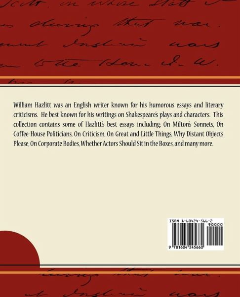 William Hazlitt was an English writer known for his humorous essays and literary criticisms. He best known for his writings on Shakespeare's plays and characters. This collection contains some of Hazlitt's best essays including; On Milton's Sonnets, On Coffee-House Politicians, On Criticism, On Great and Little Things, Why Distant Objects Please, On Corporate Bodies, Whether Actors Should Sit in the Boxes, and many more.