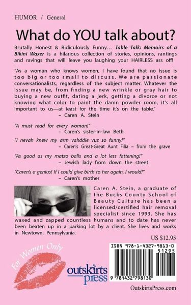 Brutally Honest & Ridiculously Funny...Table Talk: Memoirs of a Bikini Waxer is a hilarious collection of stories, opinions, rantings and ravings that will leave you laughing your hairless ass OFF! Each chapter represents a different hat worn by Caren on any given day as a hair removal specialist. The Bikini Waxer -- The Love Doctor -- The Bearded Lady -- The Belle of the Balls- no subject is off limits. Not only funny but sincere and uplifting, this book will leave any female reader with a sense of womanly pride and dynamism. "As a woman who knows women, I have found that no issue is too big or too small to discuss. We are passionate conversationalists regardless of the subject matter. Whatever the issue may be from finding a new wrinkle or a gray hair to buying a new outfit, dating a jerk, getting a divorce or not knowing what color to paint the damn powder room, it's all important to us - at least for the time it's on the table. Some women look to me for answers. I can only tell them what I would do in certain situations but it's important to tread lightly with some subjects. After all, despite what some may think, I don't have all the answers. Who on this planet does?" ~ Caren A. Stein