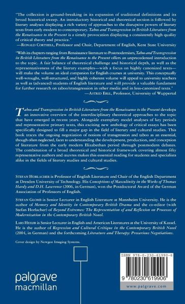 "Horlacher and his collaborators have re-opened the door on taboo. The collection is ground-breaking in its expansion of traditional definitions and its broad historical sweep. An introductory historical and theoretical section is followed by literary analyses displaying a rich variety of approaches to the disruptive powers of literary texts from early modern to contemporary. Taboo and Transgression is a timely provocation displaying a consistently high quality of critical theory and practice." - Ronald Corthell, Professor and Chair, Department of English, Kent State University