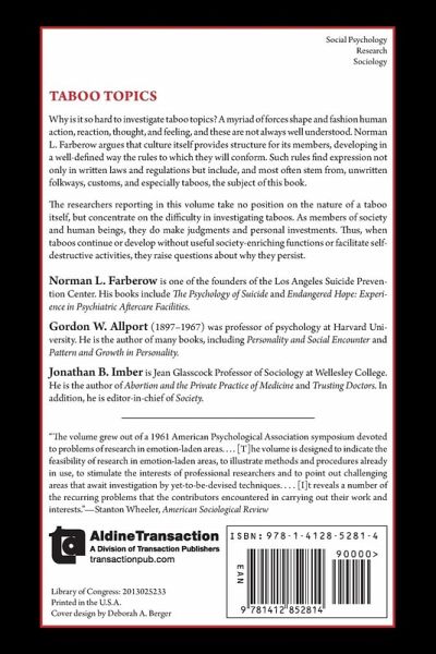 Why is it so hard to investigate taboo topics? A myriad of forces shape and fashion human action, reaction, thought, and feeling, and these are not always well understood. Norman L. Farberow argues that culture itself provides structure for its members, developing in a well-defined way the rules to which they will conform. Such rules find expression not only in written laws and regulations but include, and most often stem from, unwritten folkways, customs, and especially taboos, the subject of this book. The researchers reporting in this volume take no position on the nature of a taboo itself, but concentrate on the difficulty in investigating taboos. As members of society and human beings, they do make judgments and personal investments. Thus, when taboos continue or develop without useful society-enriching functions or facilitate self-destructive activities, they raise questions about why they persist. Such topics include many areas-some social, such as sex, death, and peace; others more academic, such as parapsychology, graphology, religion, and hypnosis. Peace and the public are included in the discussion because they are emotion-laden areas and powerful and important factors in a shrinking world and expanding universe. Peace, especially, has begun to be looked upon with suspicion-perhaps a real commentary on our times. This probing collection will be sure to interest sociologists, anthropologists, and all other social scientists.