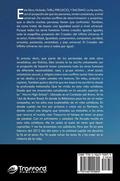 Este libro, titulado, TABU, PREJUICIO, Y RACISMO. Lo he escrito, con el proposito de que las personas, tomen conciencia, a nivel universal. De muchos conflitos de descriminacion y prejuicios. que a diario muchas personas tienen que confrontar. Tambien, de como tratar de buscar una igualdad social a nivel universal. Porque todos los seres humanos fuimos creados iguales iguales, ante la magnifica presencia del Creador del Infinito Universo. el es amor, fraternidad, igualdad, comprension, compasion, caridad, armonia, paciencia, serenidad, y paz universal. El Creador del Infinito Universo nos ama a todos por igual.