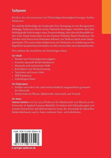 Partikel, die sich permanent mit Überlichtgeschwindigkeit bewegen, heißen Tachyonen. Die zeitliche Reihenfolge der Endpunkte ihrer Bewegung ist vom Bezugssystem abhängig. Tachyonen können keine Nachricht übertragen, vermitteln aber über beliebig große Entfernungen einen Zusammenhang, ohne dass die Kausalität verletzt wird. Damit besprechen wir das Einstein-Podolsky-Rosen Paradoxon. Ein Teilchen wird durch seine Ruhmasse definiert, ein Tachyon durch einen Impulsparameter. Wir untersuchen Stoßprozesse mit Tachyonen. In Anlehnung an den Begriff des Quasiteilchens betrachten wir über einem Gitter auch Quasitachyonen. Wir erklären die Geschichte mit Schrödingers Katze.